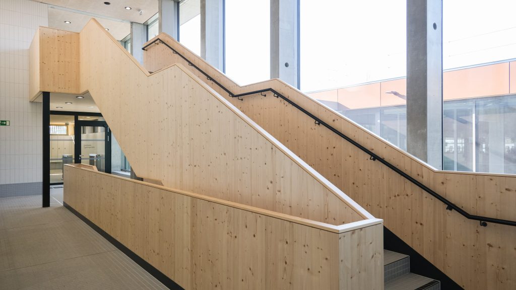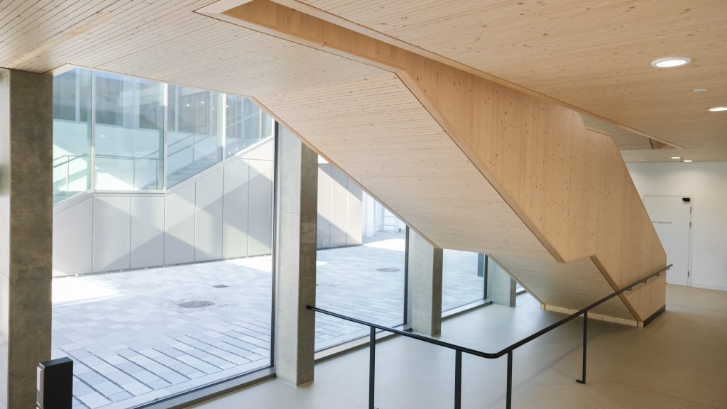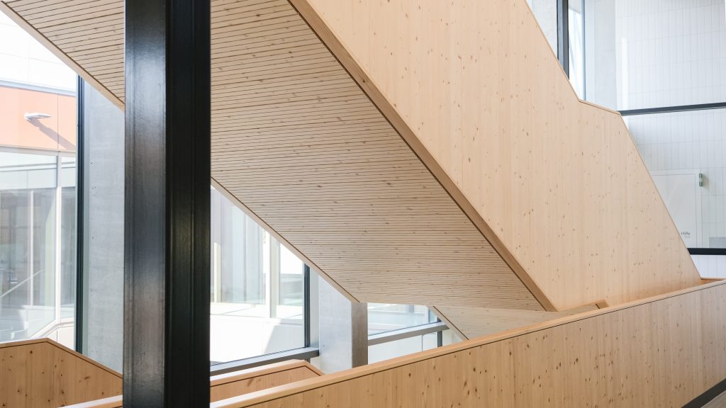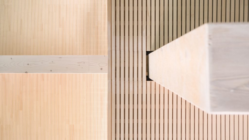 Stiegen-Untersicht aus Fichte Akustikpaneelen in Brandschutzqualifikation in B-s1-d0