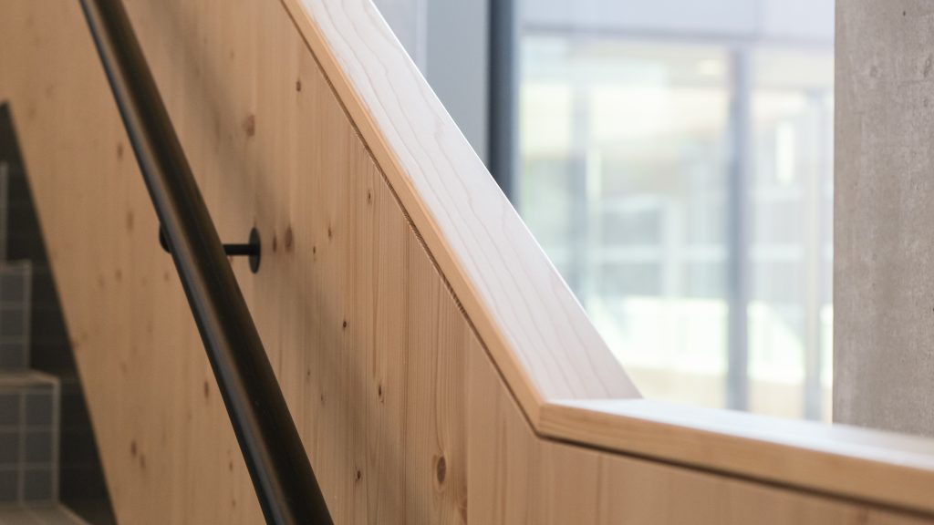 Stiegenaufgang in Fichte inklusive der schwarzen Handläufe