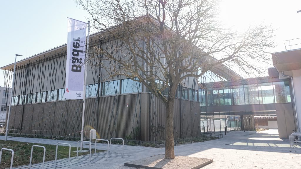 Sanierung des alten Hallenbades inklusive Ausbau mittels eines Hochdaches. Die Akustikverkleidungen in Fichte ergeben ein sehr ruhiges Gesamtbild. Holzverkleidungen sind wesentlich unempfindlicher gegen Chlordämpfe als Metallverkleidungen. Die Lichtnischen wurden mittels transluzenter Gläser luftdicht gegenüber den Chlordämpfen geschützt.